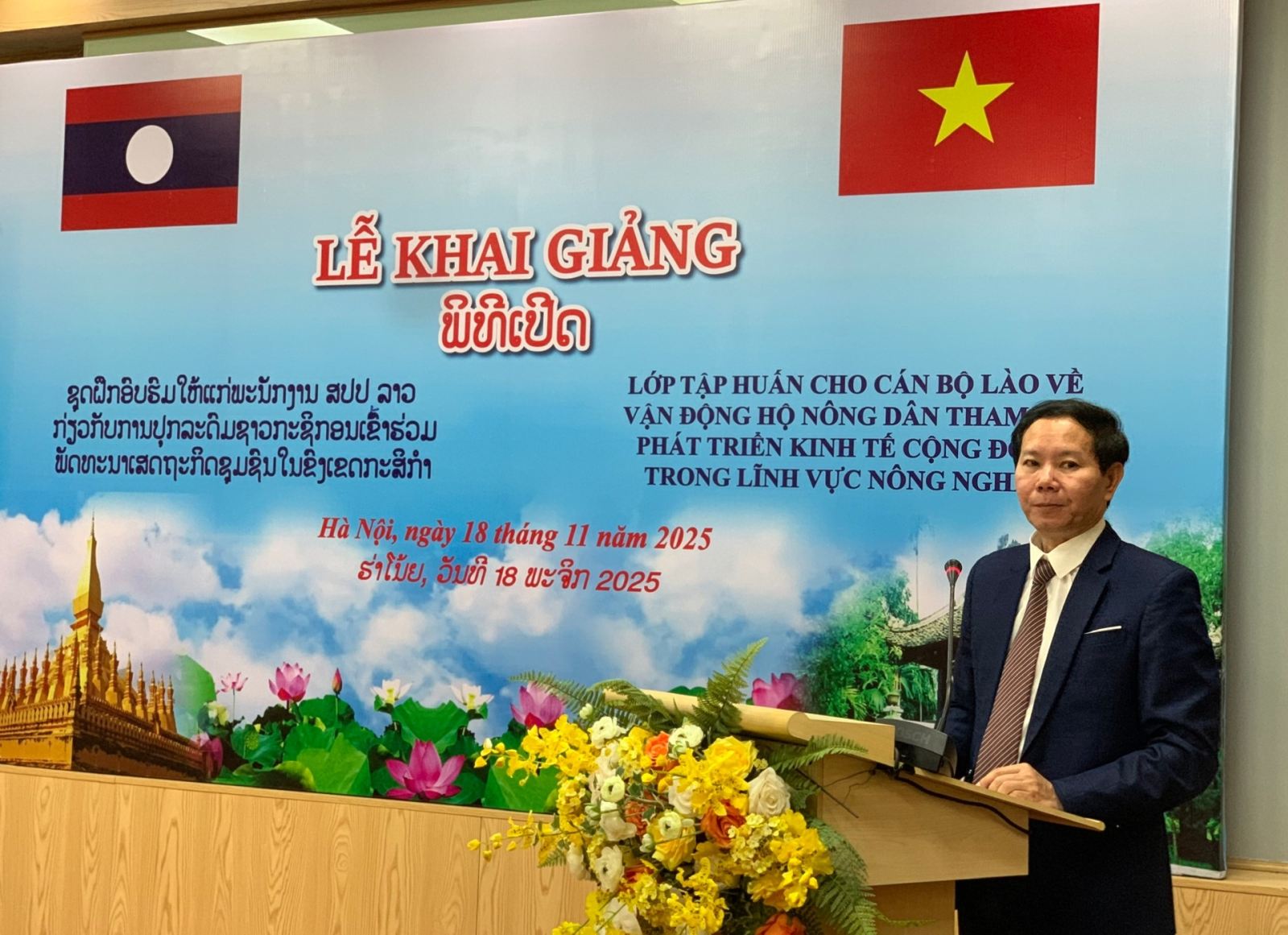 Toàn cảnh buổi lễ khai giảng lớp tập huấn cán bộ Lào về vận động hộ nông dân tham gia phát triển kinh tế cộng đồng trong lĩnh vực nông nghiệp do Viện Đào tạo, bồi dưỡng cán bộ và Nghiên cứu khoa học, Ủy ban Trung ương Mặt trận Tổ quốc Việt Nam tổ chức ngày 18/11.