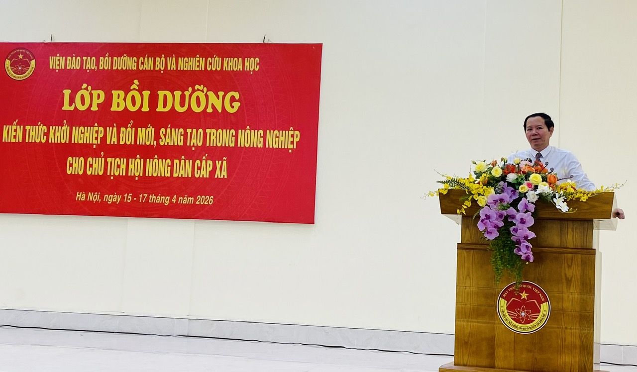 Lớp bồi dưỡng diễn ra trong 3 ngày, từ 15/4 đến 17/4/2026, với 4 chuyên đề trọng tâm gồm: Hội Nông dân Việt Nam hỗ trợ nông dân khởi nghiệp, đổi mới sáng tạo; Chuyển đổi số trong nông nghiệp và vai trò của Hội Nông dân Việt Nam trong hỗ trợ nông dân chuyển đổi số; Hỗ trợ nông dân liên kết sản xuất, kinh doanh theo chuỗi giá trị nông sản và xây dựng sản phẩm OCOP; Hỗ trợ nông dân đưa nông sản lên sàn thương mại điện tử.