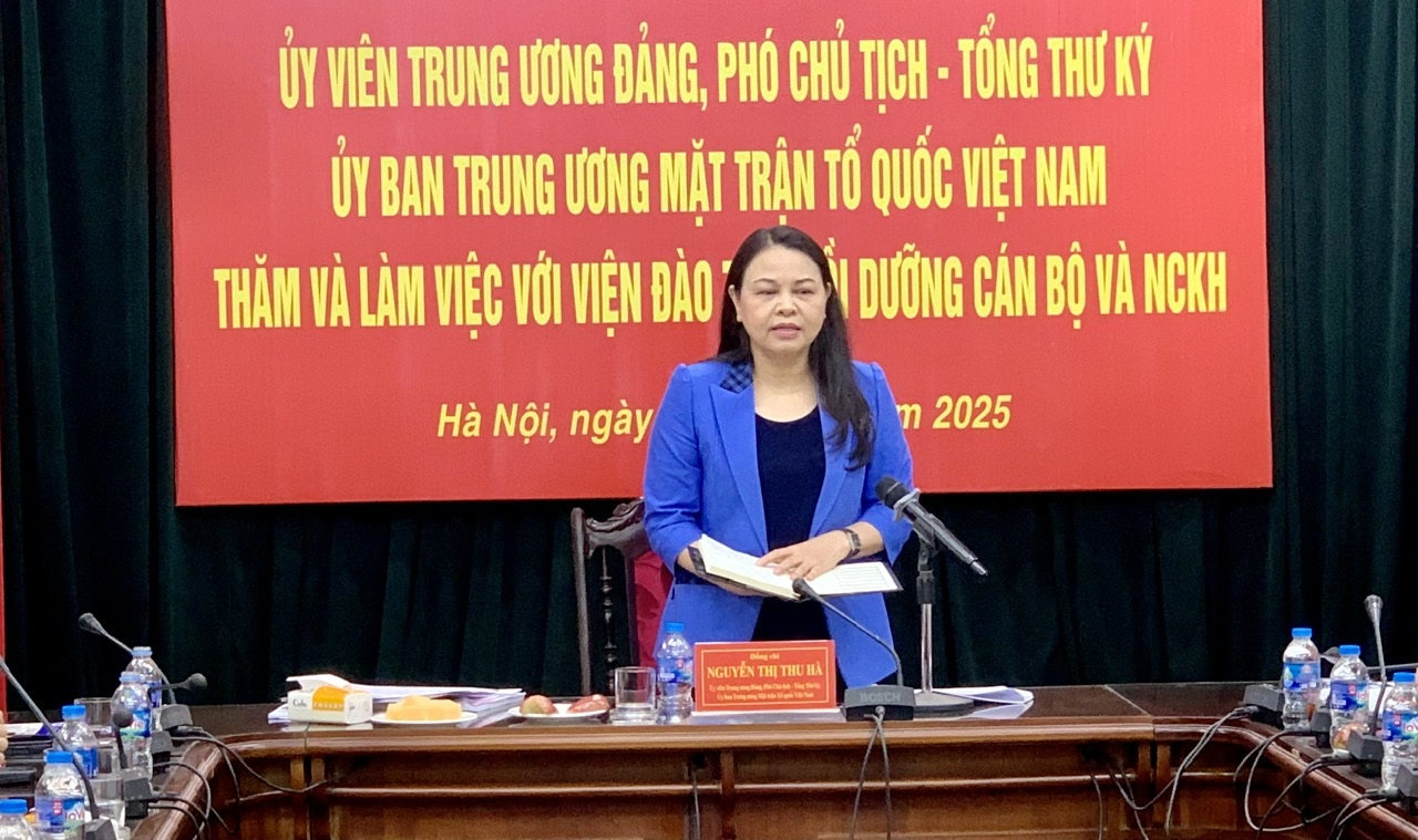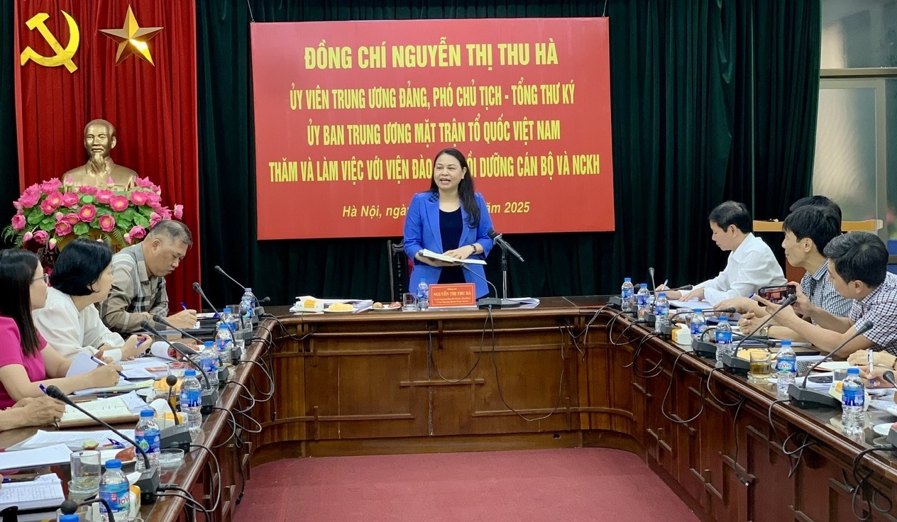 Tại buổi làm việc với Viện Đào tạo, bồi dưỡng cán bộ và nghiên cứu khoa học, đồng chí Nguyễn Thị Thu Hà - Ủy viên Trung ương Đảng, Phó Chủ tịch, Tổng Thư ký Ủy ban Trung ương MTTQ Việt Nam đã có những chỉ đạo sâu sắc, nhấn mạnh yêu cầu cấp bách phải thay đổi tư duy, đoàn kết thành một khối thống nhất và nhanh chóng triển khai các nhiệm vụ chiến lược để Viện xứng tầm với vị thế mới.